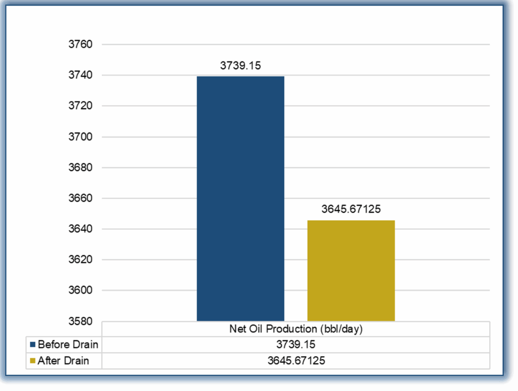 The figure shown the data was collected on 18/2/2025. This chart compares the net oil production before and after the drainage process, highlighting the change in production as a result of the drainage.